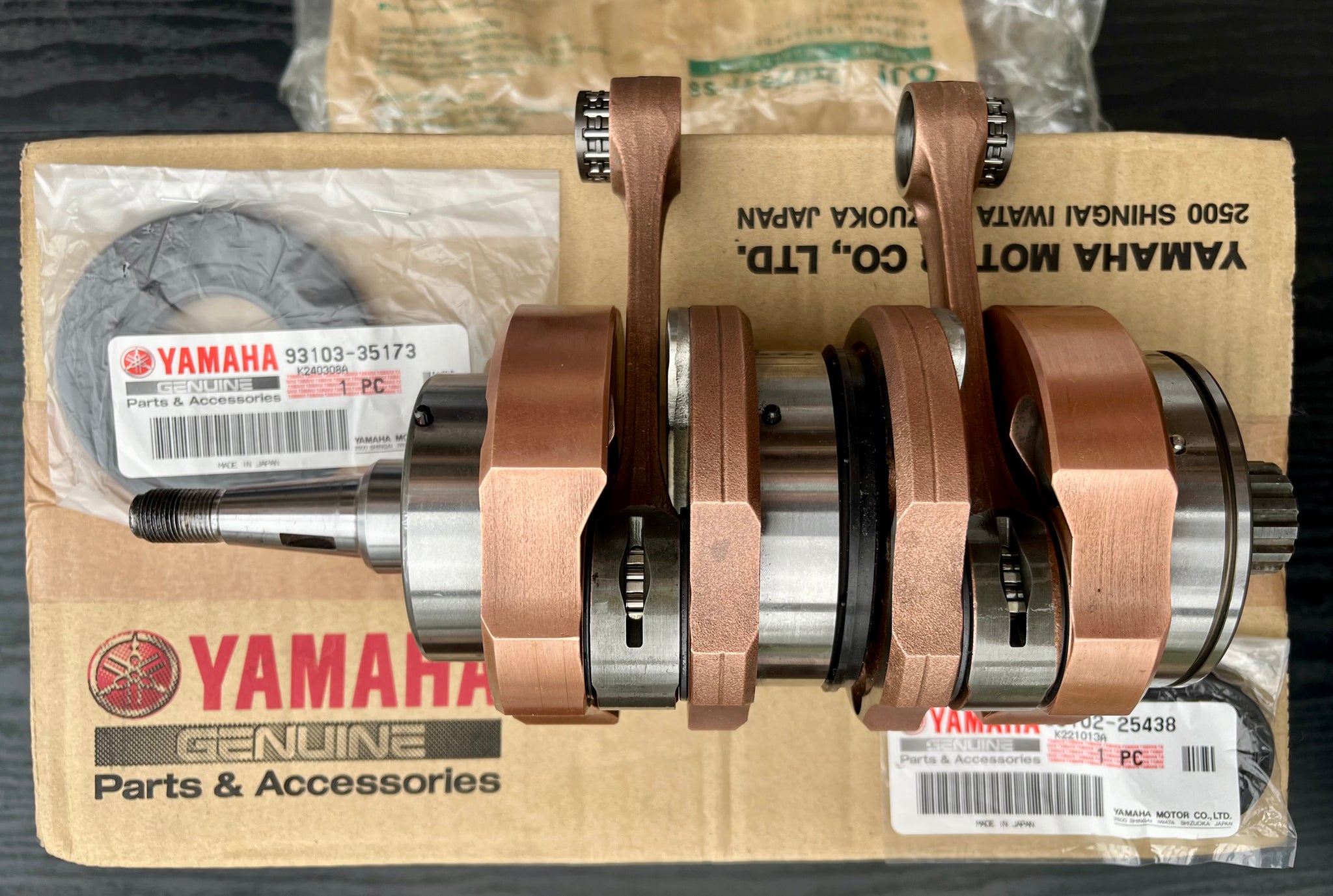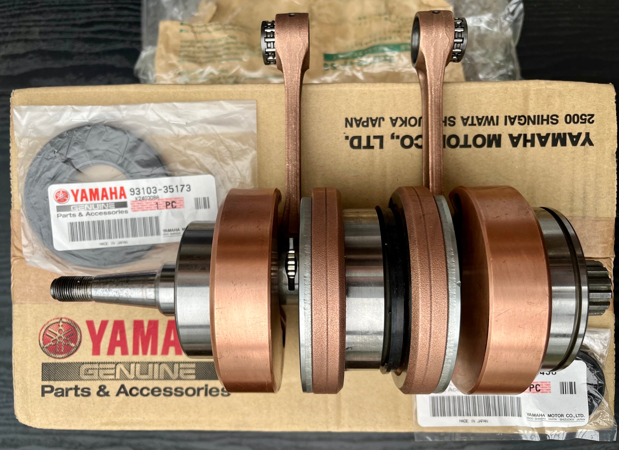 A New Yamaha TZ250 crankshaft sub-assembly with new outer main bearings and used outer flywheels.